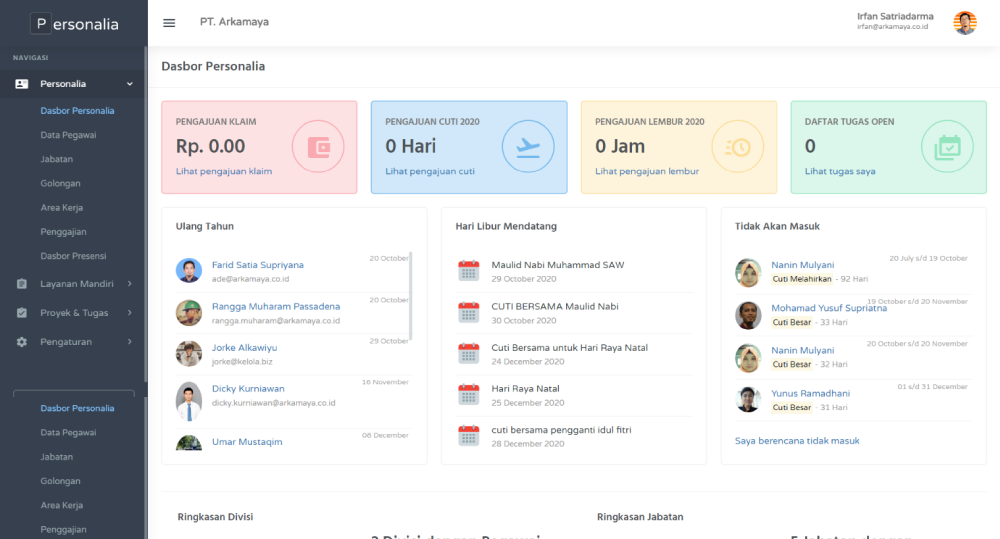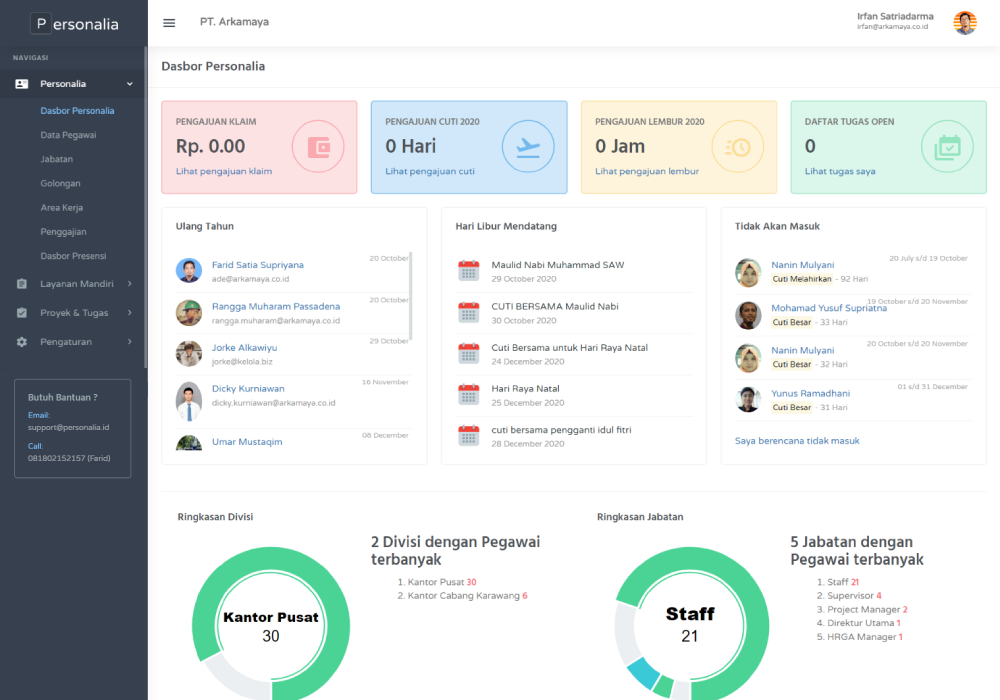 Setiap pegawai yang diundang menggunakan Personalia akan mendapatkan informasi nya di dasbor, yang menampilkan ragam informasi mulai dari Jatah Sisa Cuti Tahunan, Lembur yang diajukan, Reimburse Bulanan, Jumlah Tugas yang sedang dikerjakan, sampai infografik kondisi perusahaan yang sedang berjalan. Simak Juga fitur Bewara* sebagai media informasi antar perusahaan dan pegawai.