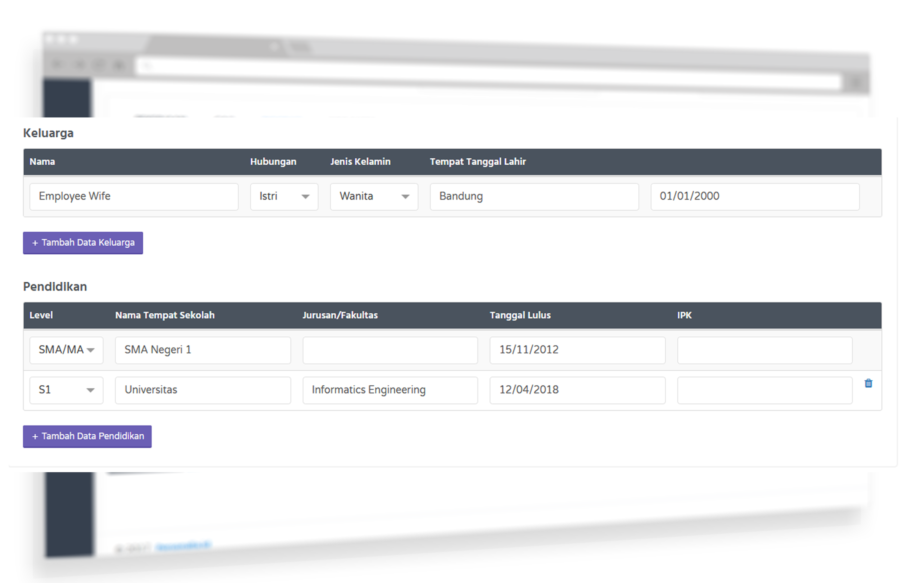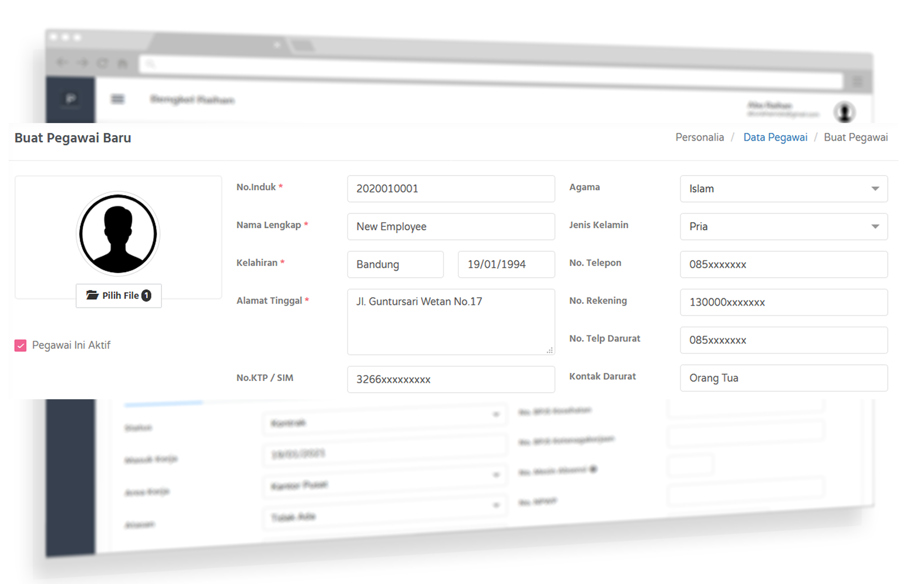 Anda dapat mendaftarkan pegawai baru dengan mengisi data pegawai dengan lengkap dari informasi pegawai, biografi, pekerjaan pegawai,dan menentukan komponen gaji sampai Proses approval pengajuan layanan mandiri Pegawai.
