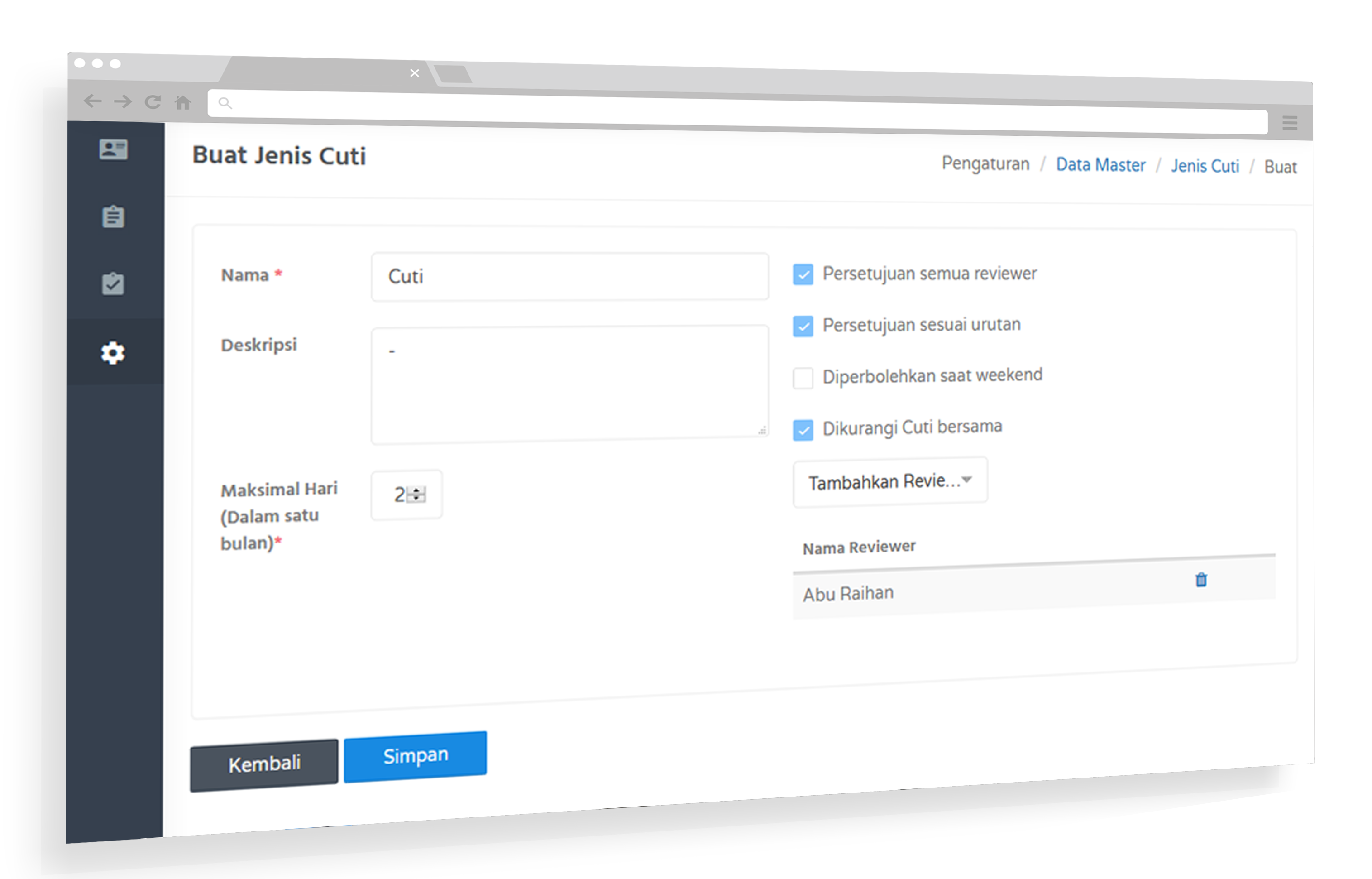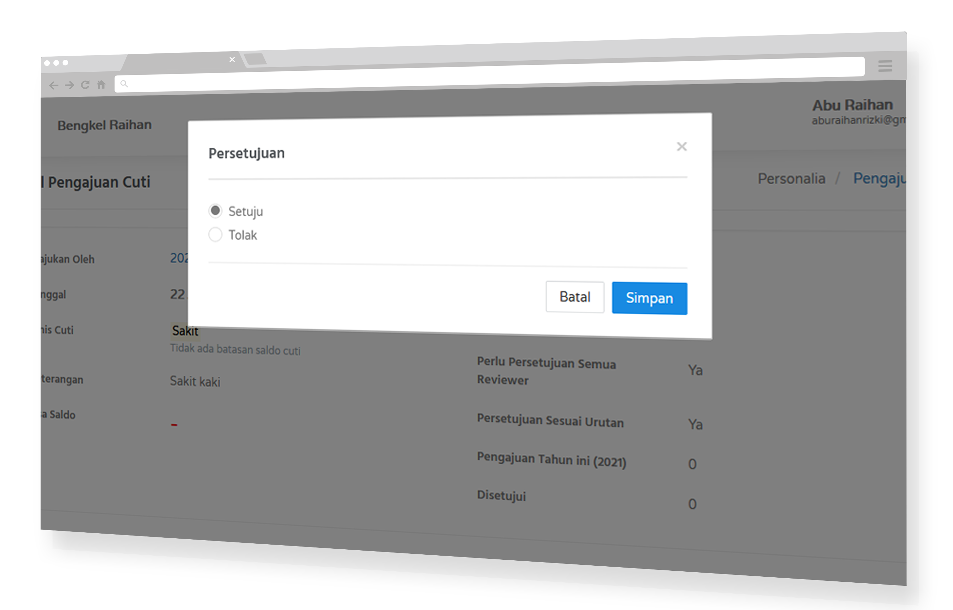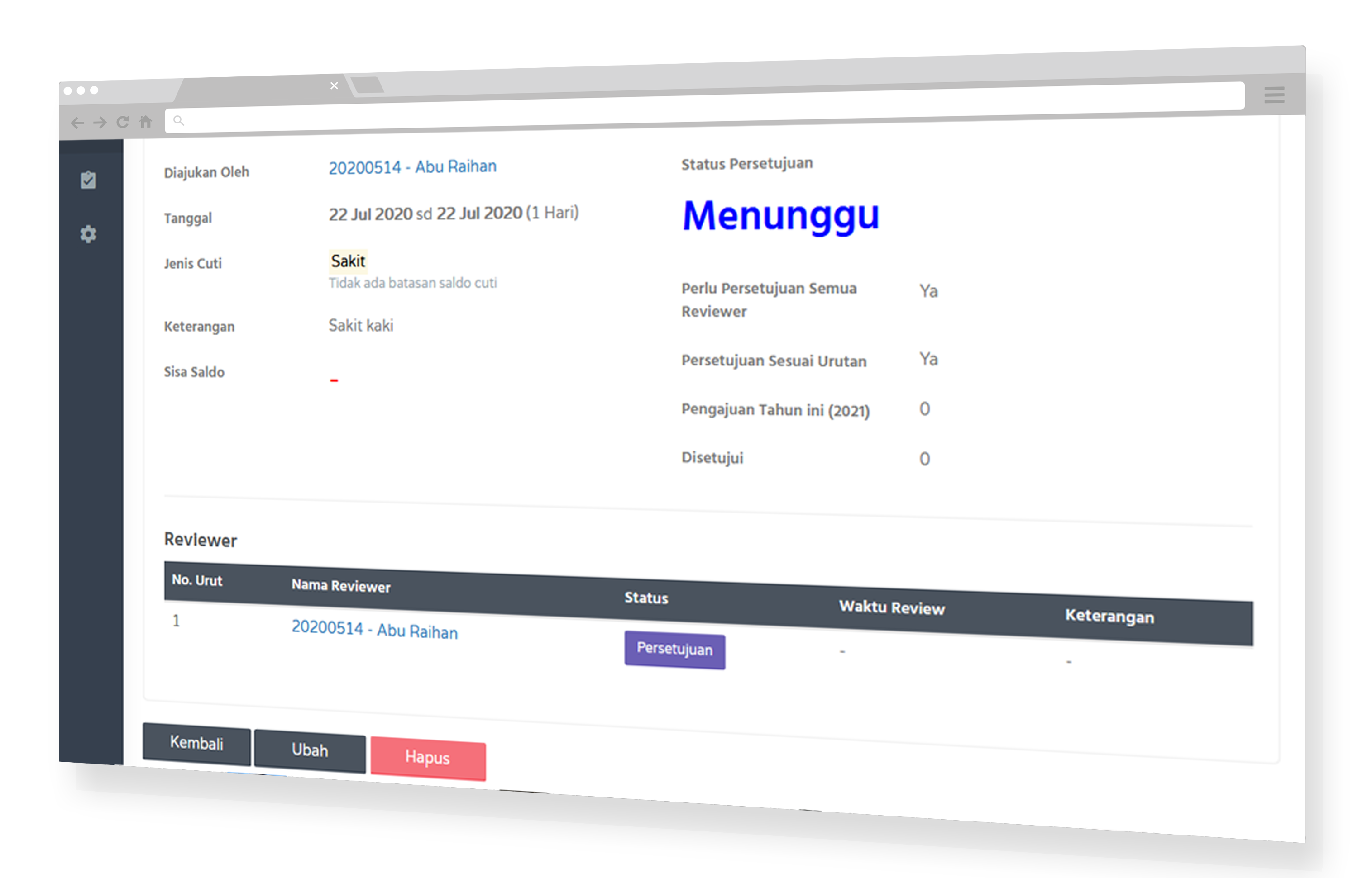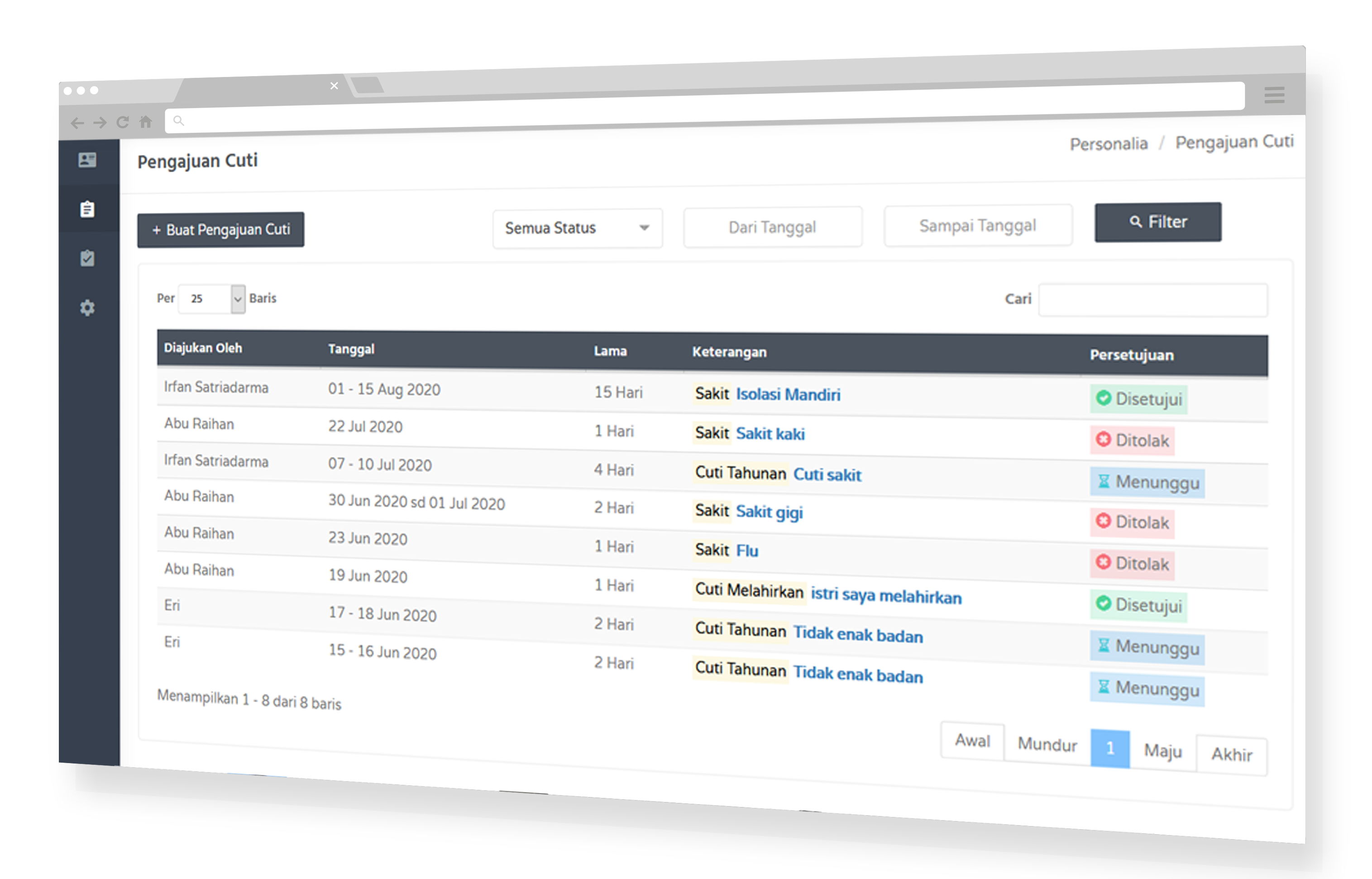 Apakah itu Cuti Sakit, Ijin, Cuti Tahunan. Semua riwayat dari ketidakhadiran pegawai akan tercatat dengan baik dan dengan proses Approval.